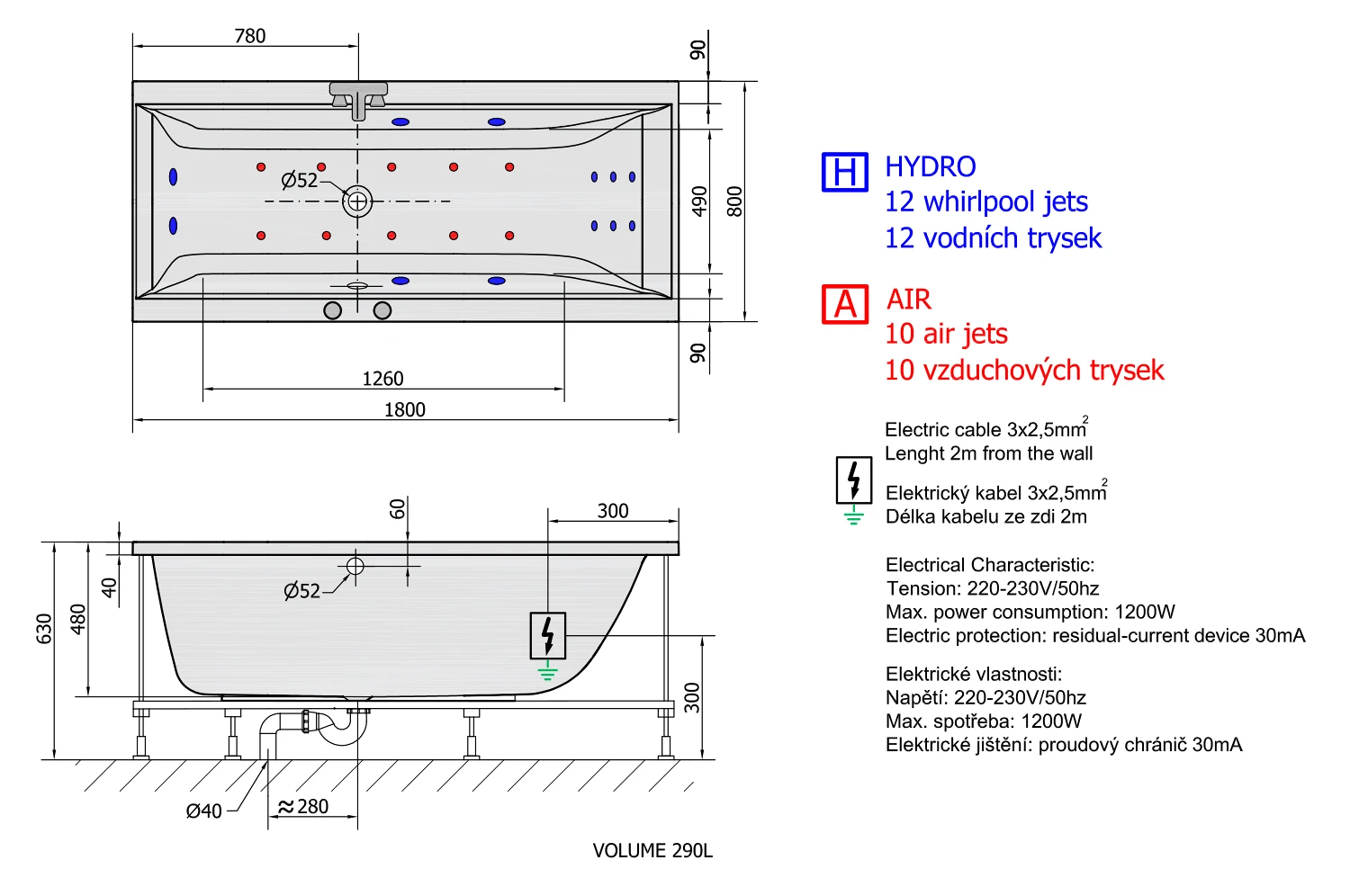 | Podsvícené ovládání | Směrově nastavitelné vodní trysky | Vzduchové trysky | Sací koš |