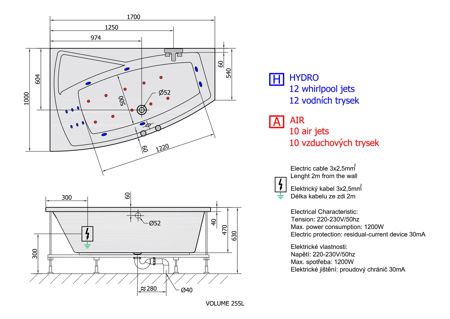 | Podsvícené ovládání | Směrově nastavitelné vodní trysky | Vzduchové trysky | Sací koš |