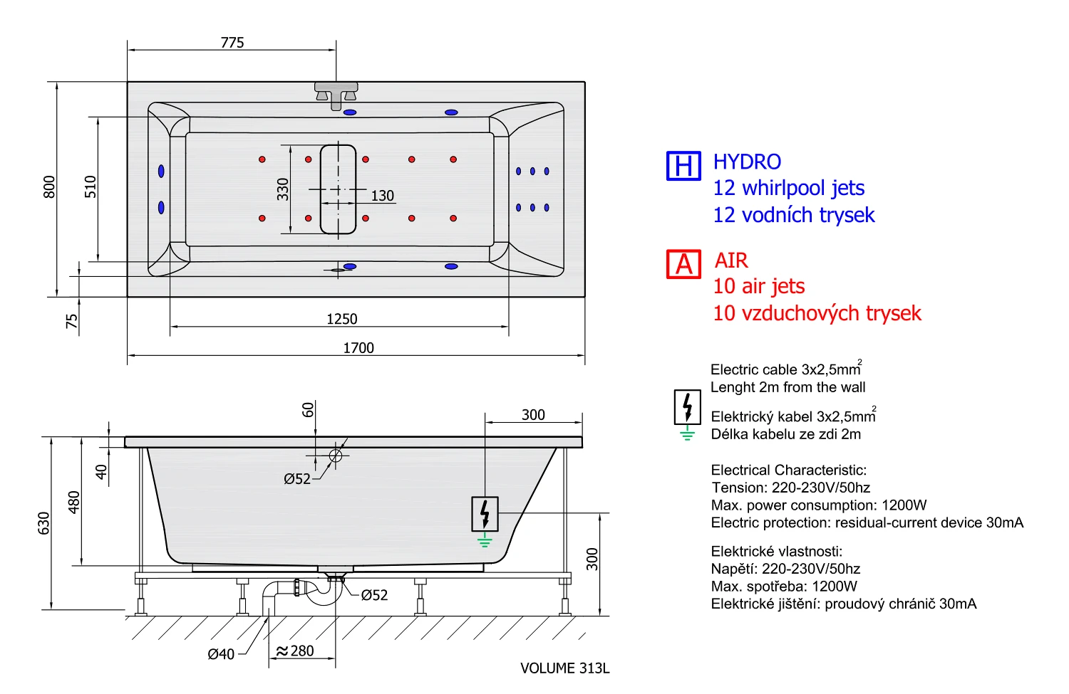 | Podsvícené ovládání | Směrově nastavitelné vodní trysky | Vzduchové trysky | Sací koš |