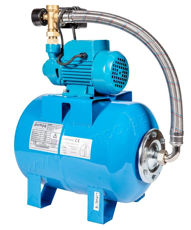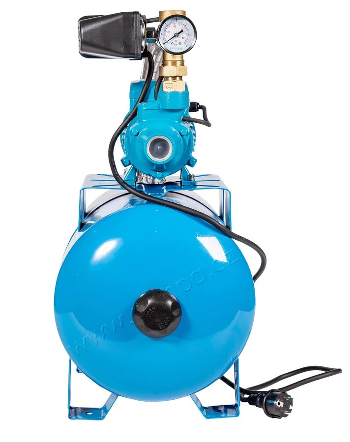 Domácí automatická vodárna PTM60 s nádobou Pumpa. Pro zásobování užitkovou vodou ze studni, pro použití v rekreačních objektech, na zahradách a pro zavlažování. Maximální schopnost sání 6 m.