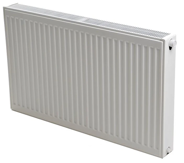 Typ VK 22 - dvoudeskový radiátor se dvěma vnitřníma konvektorama s integrovaným termostatickým ventilem Heimeier a spodním přípojením.