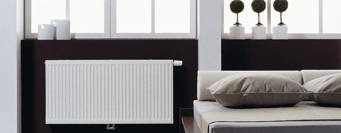 Typ VKM 22 - dvoudeskový radiátor se dvěma vnitřníma konvektorama, s integrovaným termostatickým ventilem Heimeier a spodním středovým přípojením.