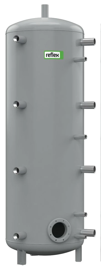 Akumulační zásobník topné a chladicí vody. Volitelně ve stojatém provedení s jednou/dvěma přírubami nebo s jedním/dvěma vnitřními výměníky tepla k připojení externích zdrojů energie.