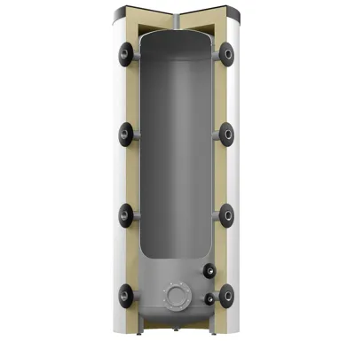 Akumulační zásobník topné a chladicí vody. Volitelně ve stojatém provedení s jednou/dvěma přírubami nebo s jedním/dvěma vnitřními výměníky tepla k připojení externích zdrojů energie.