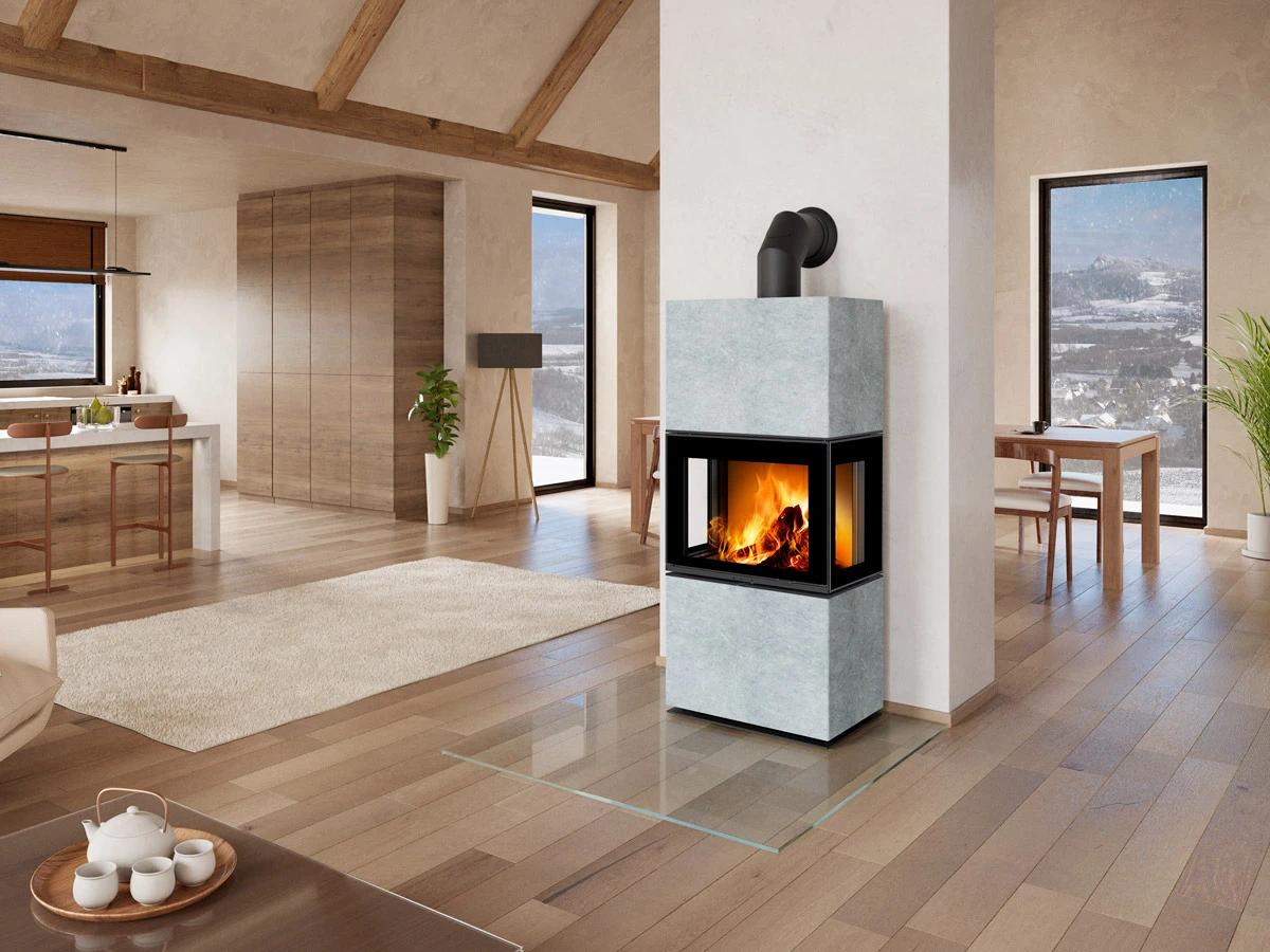 Jedná se o moderní designový krb od českého výrobce ROMOTOP, který zaujme svým třístranným prosklením a obložením z přírodního kamene serpentin (mastek).