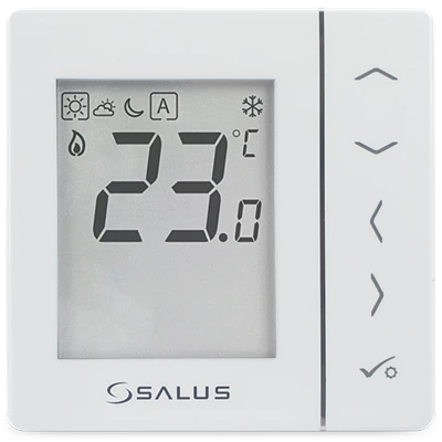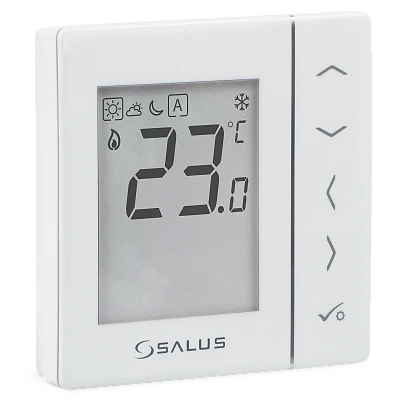 Podomítkový pokojový termostat SALUS VS35W je vhodný k regulaci podlahového vytápění / chlazení, vyznačuje se vysokou tepelnou setrvačností. Termostat lze připojit k centrální svorkovnici.