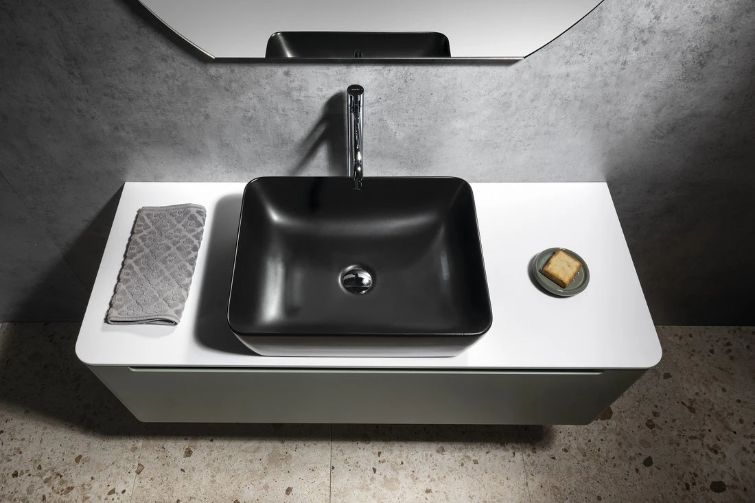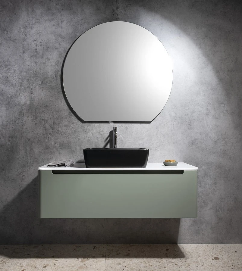 Lakovaná série nábytku KERALA pro umyvadla na postavení v moderních matných barvách se vyznačuje výrazným designovým prvkem - zaoblenými boky a čelem zásuvky. Skříňky jsou jednozásuvkové, bezúchytkové a s plynulým dovíráním. V nabídce jsou 2 typy desek o tl.12 mm: bílá matná Rockstone a černá matná kompaktní deska PREMIO z vysokotlakého laminátu. Umyvadlo na desku lze libovolně umístit po celé šířce skříňky. Umyvadlové skříňky nabízíme v šířkách 80, 100, 120 a 140 cm a lze je doplnit o vysokou dvířkovou skříňku ve stejném oblém designu.