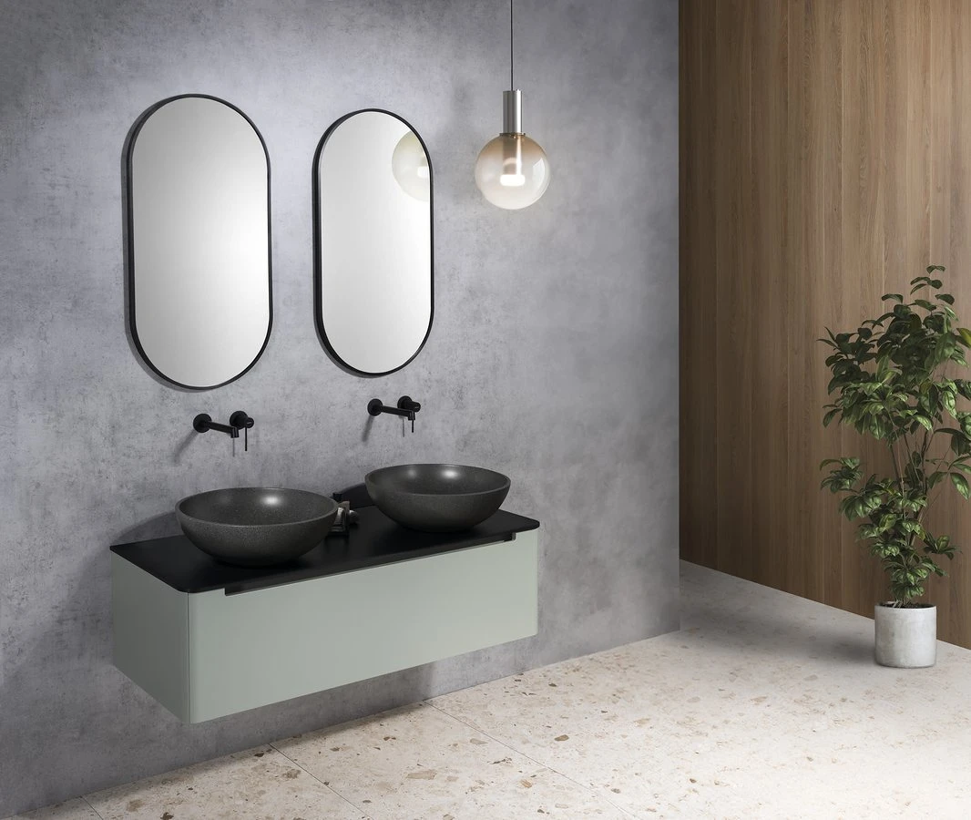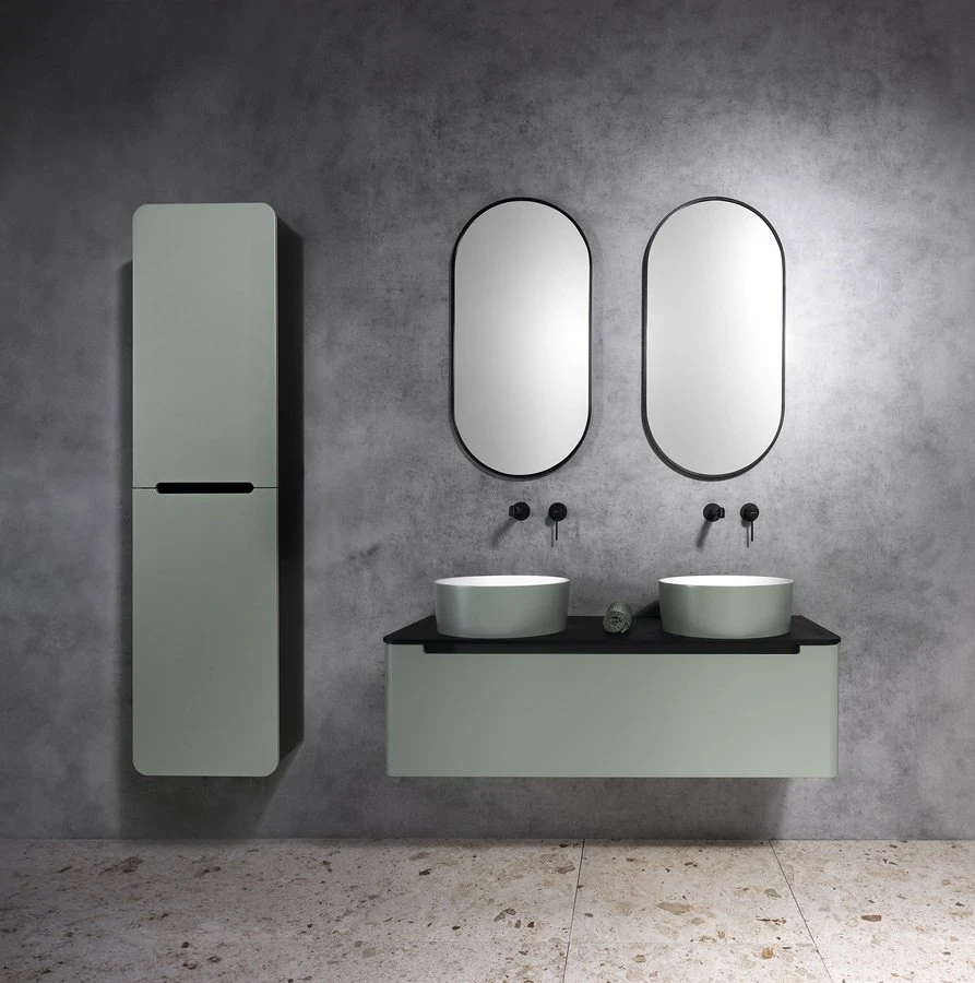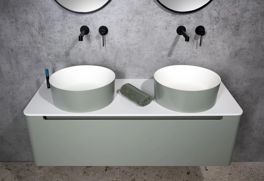 Lakovaná série nábytku KERALA pro umyvadla na postavení v moderních matných barvách se vyznačuje výrazným designovým prvkem - zaoblenými boky a čelem zásuvky. Skříňky jsou jednozásuvkové, bezúchytkové a s plynulým dovíráním. V nabídce jsou 2 typy desek o tl.12 mm: bílá matná Rockstone a černá matná kompaktní deska PREMIO z vysokotlakého laminátu. Umyvadlo na desku lze libovolně umístit po celé šířce skříňky. Umyvadlové skříňky nabízíme v šířkách 80, 100, 120 a 140 cm a lze je doplnit o vysokou dvířkovou skříňku ve stejném oblém designu.