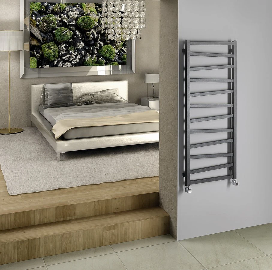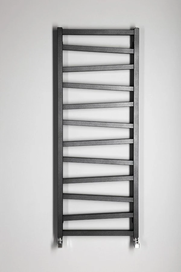 Otopné těleso s různoběžnými středovými trubkami podtrhne design koupelny. Možná kombinace ústředního a elektrického vytápění. V nabídce v barvách bílá, strukturální antracit a černá mat.