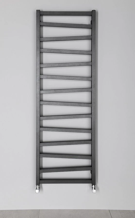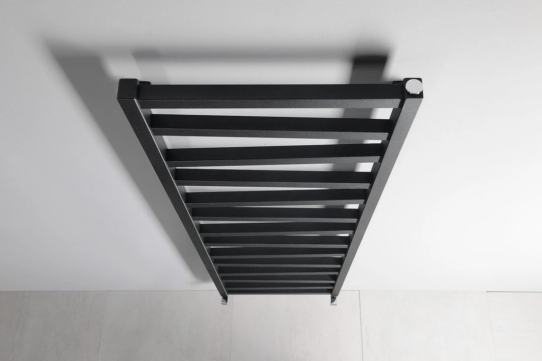Otopné těleso s různoběžnými středovými trubkami podtrhne design koupelny. Možná kombinace ústředního a elektrického vytápění. V nabídce v barvách bílá, strukturální antracit a černá mat.