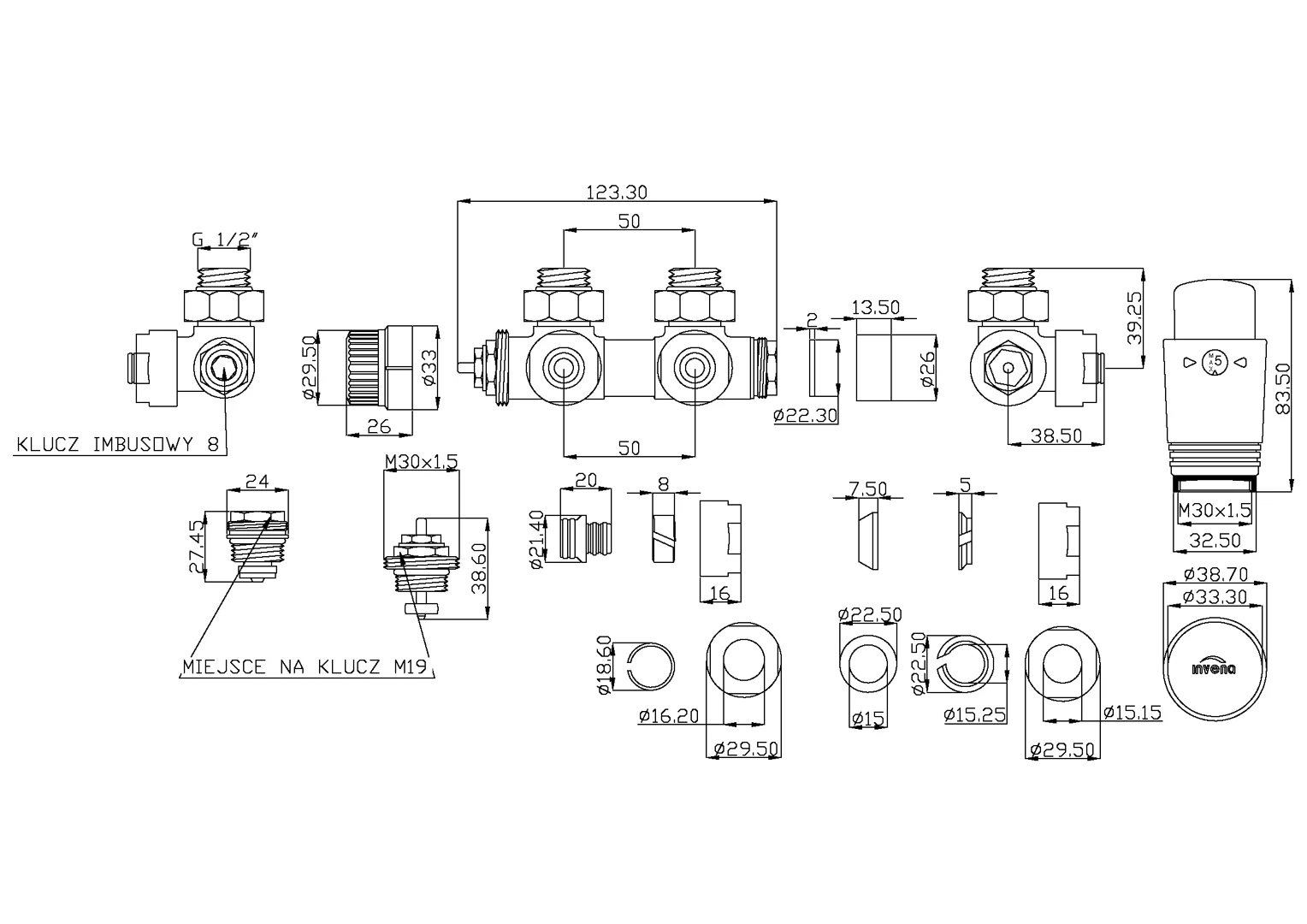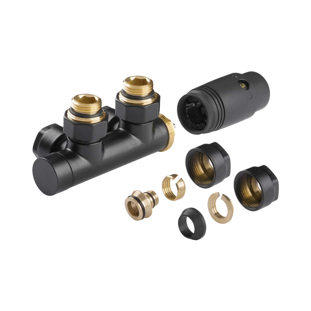 Termostatická sada ventilů typu pro středové připojení, se používá pro regulaci průtoku vody do radiátorů. Tato sada ventilů je navržena pro použití na měděné nebo alupex trubky. Ventily fungují na principu termostatu, který reaguje na teplotu v místnosti. Pokud se teplota zvýší nad nastavenou úroveň, termostat uzavře ventil, což sníží průtok teplé vody do radiátoru. Pokud se teplota v místnosti sníží pod nastavenou úroveň, termostat opět ventil otevře.