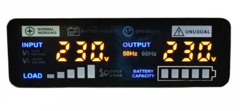 Provozní stavy se zobrazují na předním LED displeji. Záložní zdroj má také akustickou signalizaci případné poruchy nebo chyby.
