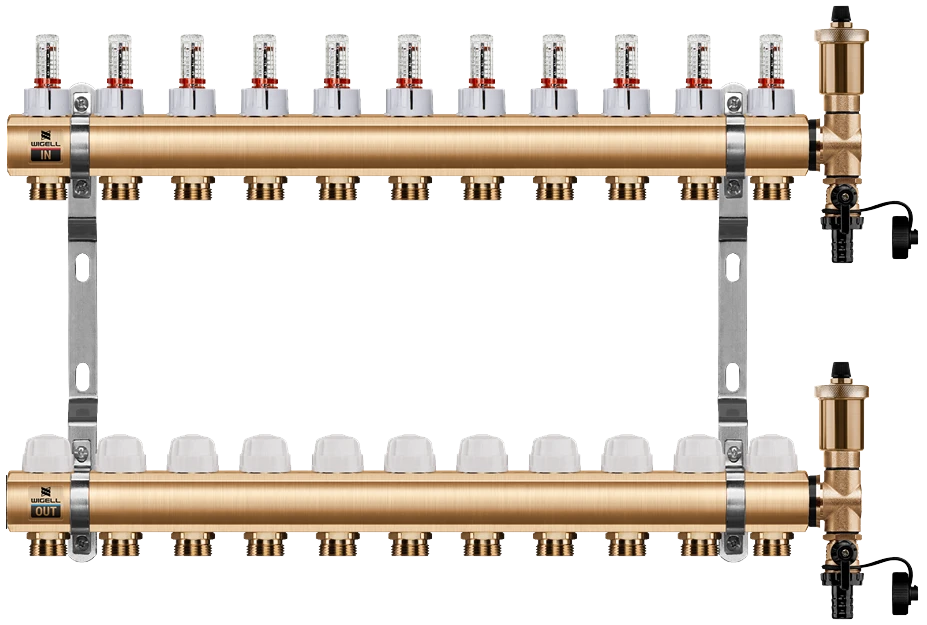 WIGELL mosazný rozdělovač 11 okruhů - rozdělovač podlahového vytápění s hlavicemi a průtokoměry