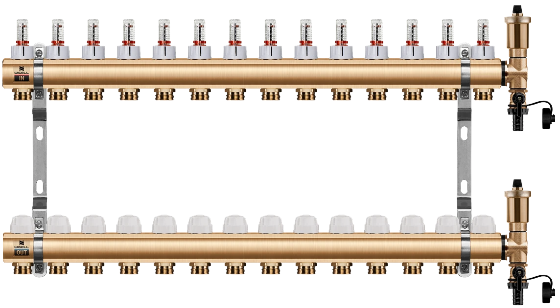 WIGELL mosazný rozdělovač 14 okruhů - rozdělovač podlahového vytápění s hlavicemi a průtokoměry