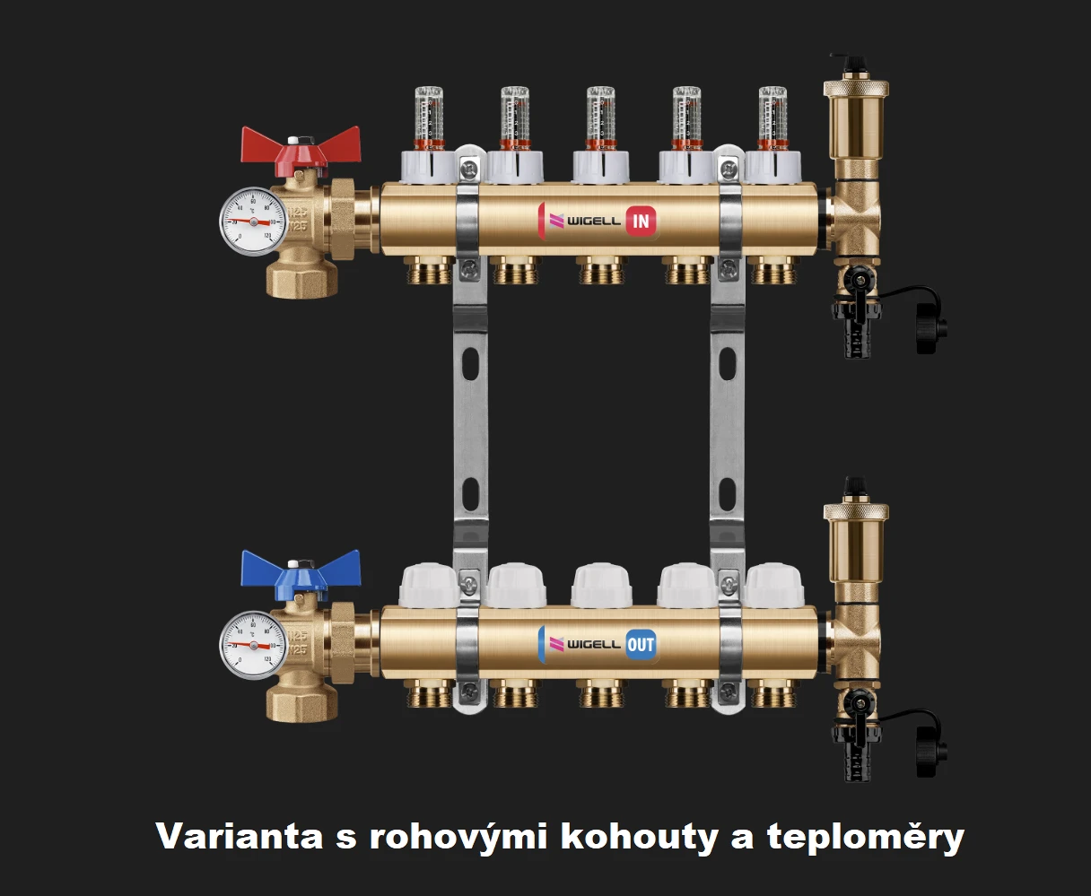 Mosazný rozdělovač je výrobený v EU. Je určený jak pro podlahové vytápění tak pro připojení otopných těles (radiátorů). Velkou výhodou je jednoduchá montáž a velmi jednoduché vyregulování jednotlivých otopných okruhů topného systému díky průtokoměrům. Rozdělovače mohou být osazeny kulovými kohouty se šroubením a teploměry jak v přímém, tak rohovém provedení.Ruční hlavice lze nahradit termoelektrickými pohony WIGELL. Pro ovládání elektrických pohonů doporučujeme prostorový termostat Elektrobock PT713-EI osazený kapilárou do podlahy pro hlídaní teploty podlahy. Jinak lze použít jakýkoliv spínací termostat na 230V nebo 24V dle použitého elektropohonu WIGELL.