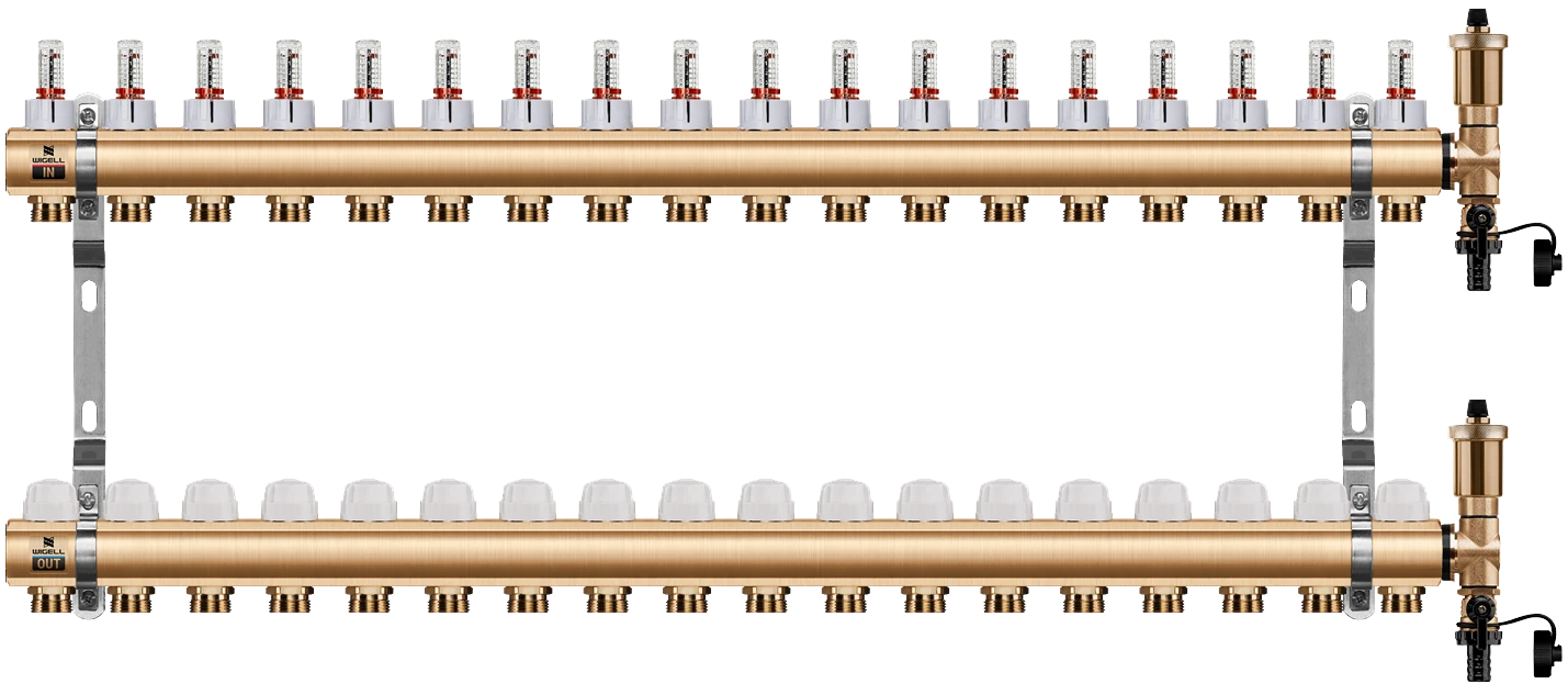 WIGELL mosazný rozdělovač 18 okruhů - rozdělovač podlahového vytápění s hlavicemi a průtokoměry