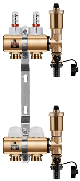 WIGELL mosazný rozdělovač 2 okruhy - rozdělovač podlahového vytápění s hlavicemi a průtokoměry