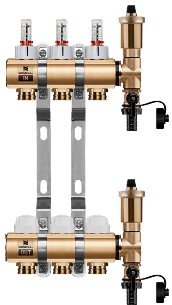 Mosazný rozdělovač je výrobený v EU. Je určený jak pro podlahové vytápění tak pro připojení otopných těles (radiátorů). Velkou výhodou je jednoduchá montáž a velmi jednoduché vyregulování jednotlivých otopných okruhů topného systému díky průtokoměrům. Rozdělovače mohou být osazeny kulovými kohouty se šroubením a teploměry jak v přímém, tak rohovém provedení.Ruční hlavice lze nahradit termoelektrickými pohony WIGELL. Pro ovládání elektrických pohonů doporučujeme prostorový termostat Elektrobock PT713-EI osazený kapilárou do podlahy pro hlídaní teploty podlahy. Jinak lze použít jakýkoliv spínací termostat na 230V nebo 24V dle použitého elektropohonu WIGELL.