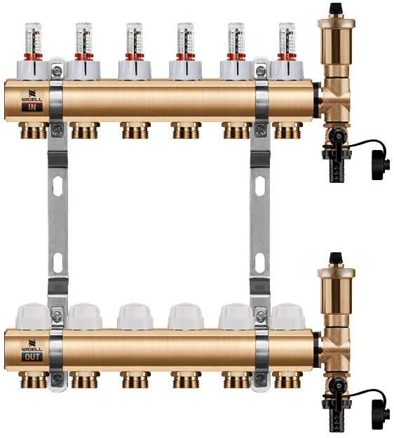 Mosazný rozdělovač je výrobený v EU. Je určený jak pro podlahové vytápění tak pro připojení otopných těles (radiátorů). Velkou výhodou je jednoduchá montáž a velmi jednoduché vyregulování jednotlivých otopných okruhů topného systému díky průtokoměrům. Rozdělovače mohou být osazeny kulovými kohouty se šroubením a teploměry jak v přímém, tak rohovém provedení.Ruční hlavice lze nahradit termoelektrickými pohony WIGELL. Pro ovládání elektrických pohonů doporučujeme prostorový termostat Elektrobock PT713-EI osazený kapilárou do podlahy pro hlídaní teploty podlahy. Jinak lze použít jakýkoliv spínací termostat na 230V nebo 24V dle použitého elektropohonu WIGELL.