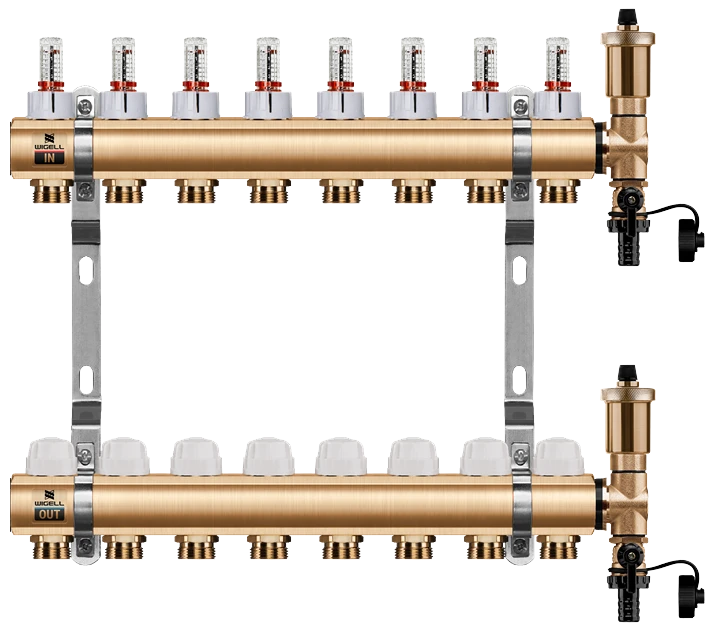 WIGELL mosazný rozdělovač 8 okruhů - rozdělovač podlahového vytápění s hlavicemi a průtokoměry