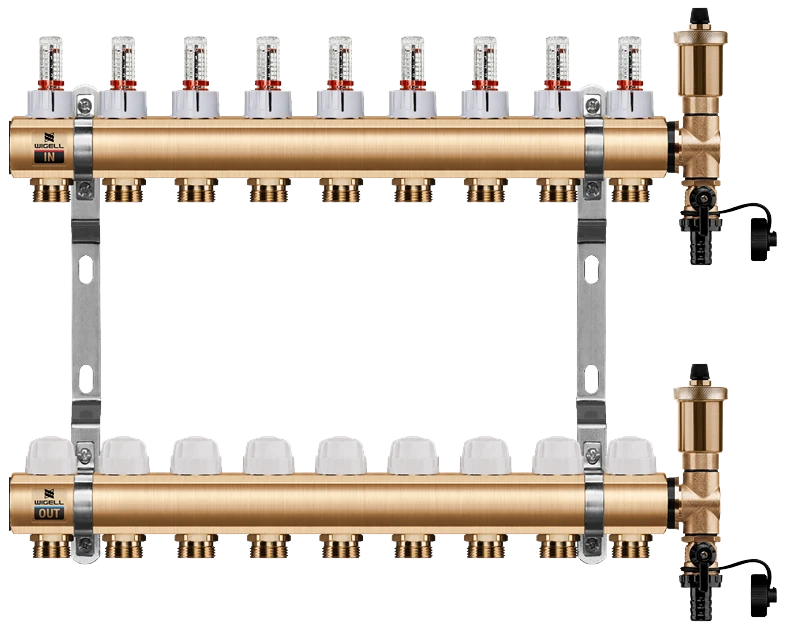 WIGELL mosazný rozdělovač 9 okruhů - rozdělovač podlahového vytápění s hlavicemi a průtokoměry