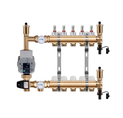 WIGELL mosazný rozdělovač s čerpadlem a nastavení teploty 8 okruhů - rozdělovač podlahového vytápění s hlavicemi a průtokoměry