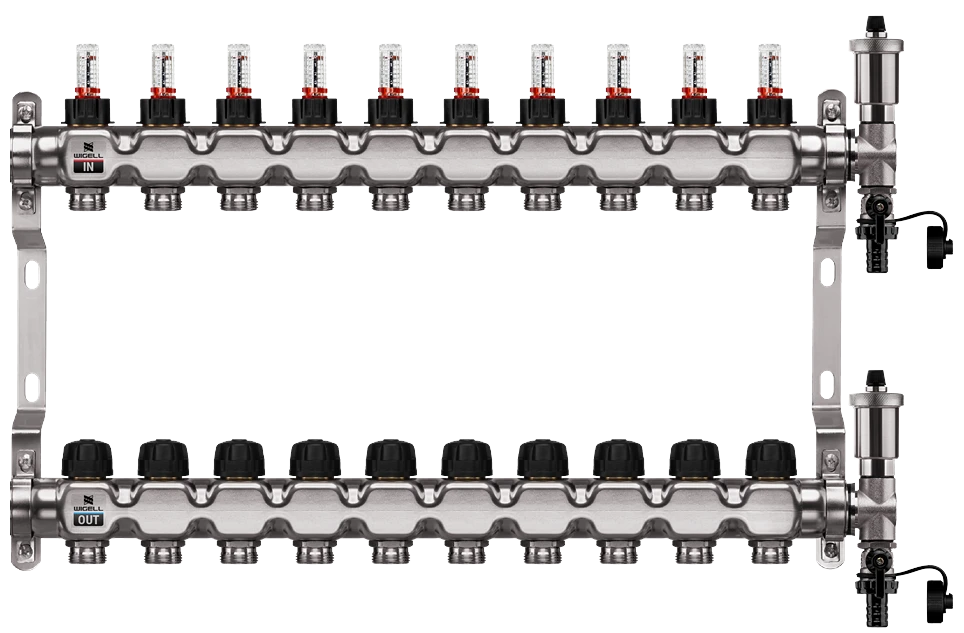 WIGELL nerezový rozdělovač 10 okruhů - rozdělovač podlahového vytápění s hlavicemi a průtokoměry