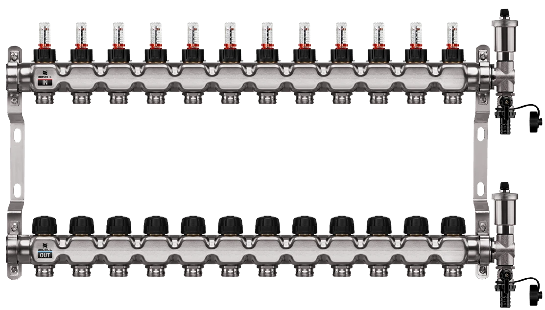 Nerezový rozdělovač je výroben v EU. Je určený jak pro podlahové vytápění tak pro připojení otopných těles (radiátorů). Velkou výhodou je jednoduchá montáž a velmi jednoduché vyregulování jednotlivých otopných okruhů topného systému díky průtokoměrům. Rozdělovače mohou být osazeny kulovými kohouty se šroubením a teploměry jak v přímém, tak rohovém provedení. Ruční hlavice lze nahradit termoelektrickými pohony WIGELL. Pro ovládání elektrických pohonů doporučujeme prostorový termostat Elektrobock PT713-EI osazený kapilárou do podlahy pro hlídaní teploty podlahy. Jinak lze použít jakýkoliv spínací termostat na 230V nebo 24V dle použitého elektropohonu WIGELL.
