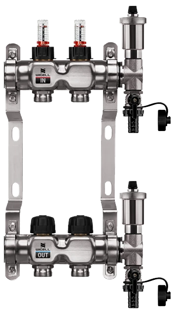 Nerezový rozdělovač je výroben v EU. Je určený jak pro podlahové vytápění tak pro připojení otopných těles (radiátorů). Velkou výhodou je jednoduchá montáž a velmi jednoduché vyregulování jednotlivých otopných okruhů topného systému díky průtokoměrům. Rozdělovače mohou být osazeny kulovými kohouty se šroubením a teploměry jak v přímém, tak rohovém provedení. Ruční hlavice lze nahradit termoelektrickými pohony WIGELL. Pro ovládání elektrických pohonů doporučujeme prostorový termostat Elektrobock PT713-EI osazený kapilárou do podlahy pro hlídaní teploty podlahy. Jinak lze použít jakýkoliv spínací termostat na 230V nebo 24V dle použitého elektropohonu WIGELL.