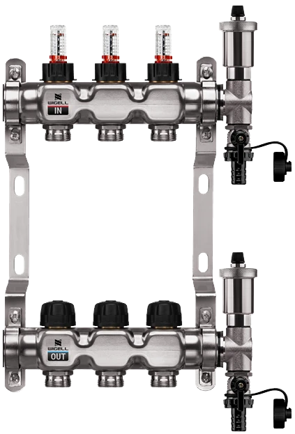 Nerezový rozdělovač je výroben v EU. Je určený jak pro podlahové vytápění tak pro připojení otopných těles (radiátorů). Velkou výhodou je jednoduchá montáž a velmi jednoduché vyregulování jednotlivých otopných okruhů topného systému díky průtokoměrům. Rozdělovače mohou být osazeny kulovými kohouty se šroubením a teploměry jak v přímém, tak rohovém provedení. Ruční hlavice lze nahradit termoelektrickými pohony WIGELL. Pro ovládání elektrických pohonů doporučujeme prostorový termostat Elektrobock PT713-EI osazený kapilárou do podlahy pro hlídaní teploty podlahy. Jinak lze použít jakýkoliv spínací termostat na 230V nebo 24V dle použitého elektropohonu WIGELL.