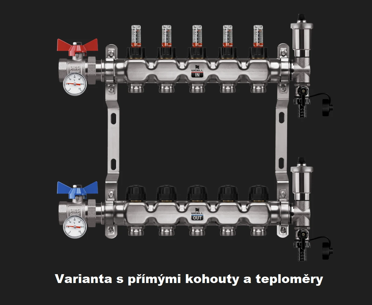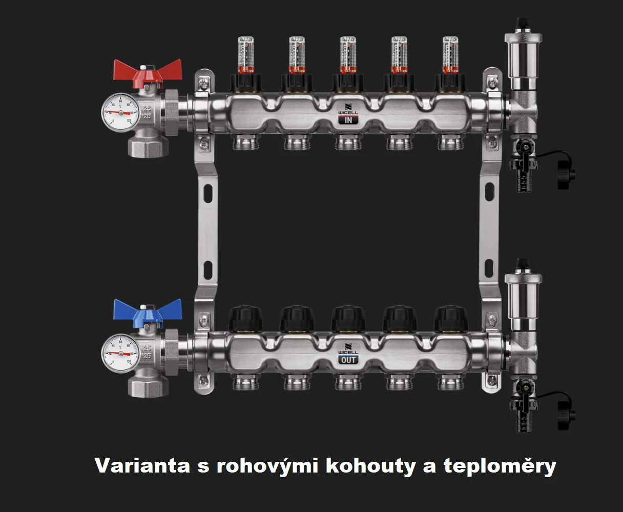 Nerezový rozdělovač je výroben v EU. Je určený jak pro podlahové vytápění tak pro připojení otopných těles (radiátorů). Velkou výhodou je jednoduchá montáž a velmi jednoduché vyregulování jednotlivých otopných okruhů topného systému díky průtokoměrům. Rozdělovače mohou být osazeny kulovými kohouty se šroubením a teploměry jak v přímém, tak rohovém provedení. Ruční hlavice lze nahradit termoelektrickými pohony WIGELL. Pro ovládání elektrických pohonů doporučujeme prostorový termostat Elektrobock PT713-EI osazený kapilárou do podlahy pro hlídaní teploty podlahy. Jinak lze použít jakýkoliv spínací termostat na 230V nebo 24V dle použitého elektropohonu WIGELL.