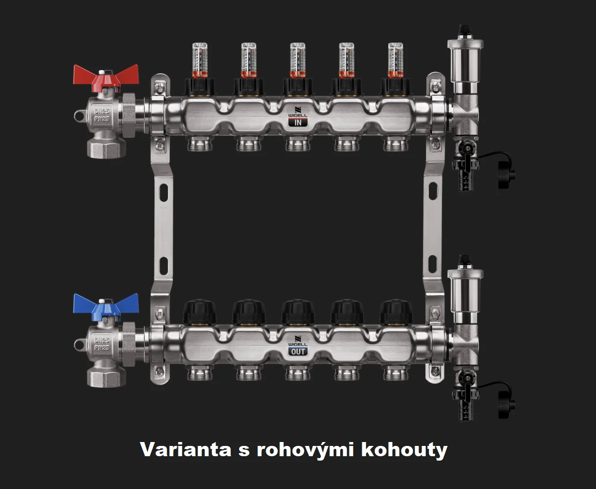 WIGELL nerezový rozdělovač 6 okruhů - rozdělovač podlahového vytápění s hlavicemi a průtokoměry