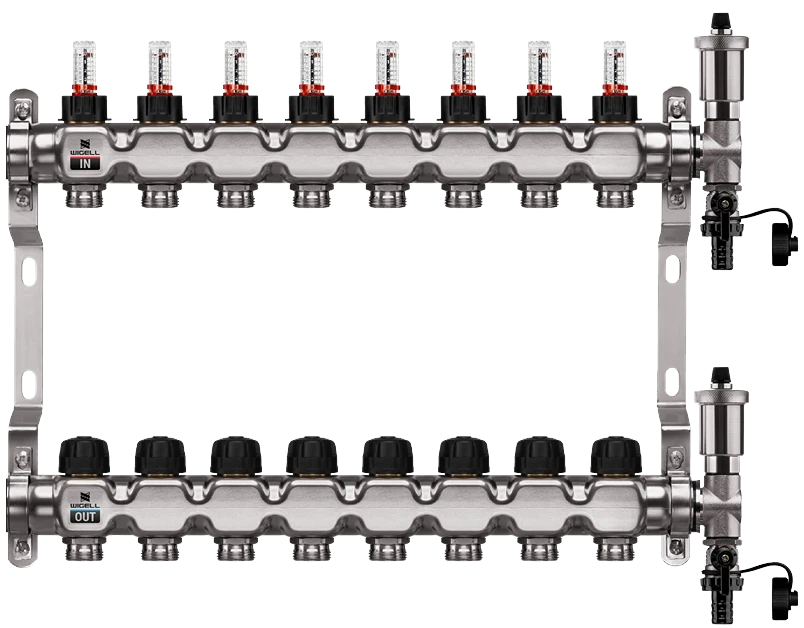 WIGELL nerezový rozdělovač 8 okruhů - rozdělovač podlahového vytápění s hlavicemi a průtokoměry