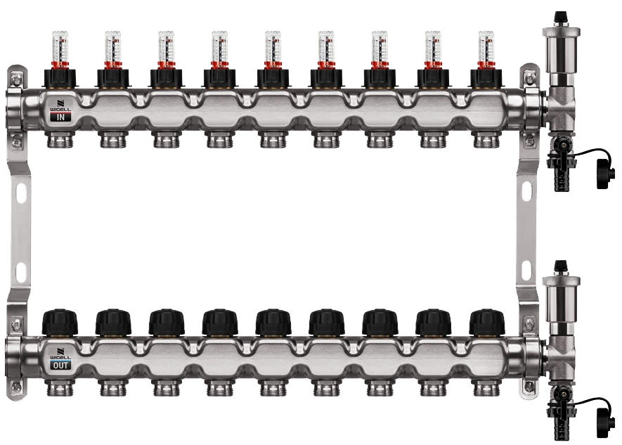 WIGELL nerezový rozdělovač 9 okruhů - rozdělovač podlahového vytápění s hlavicemi a průtokoměry
