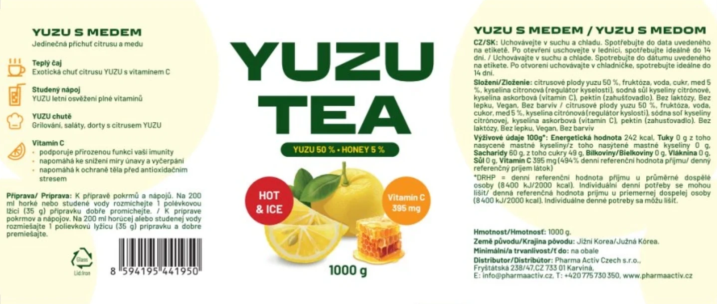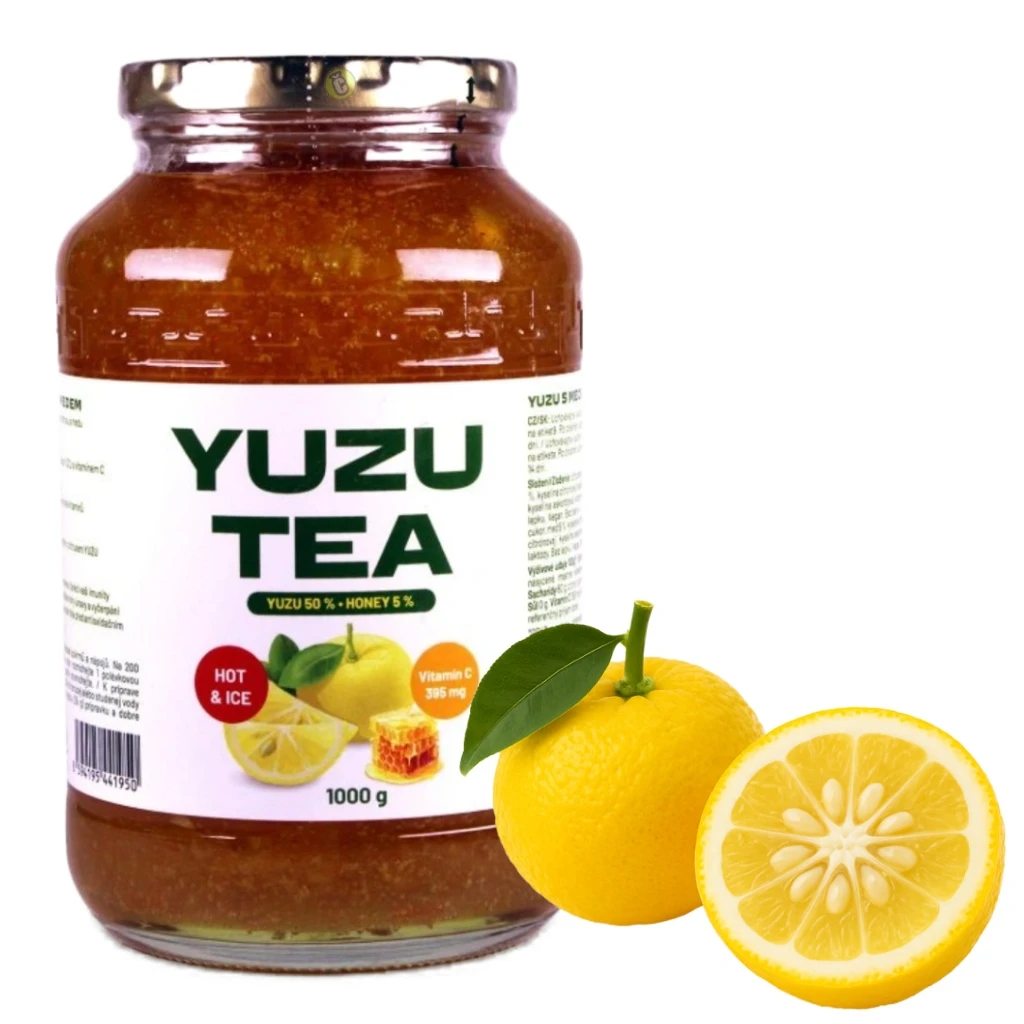 Yuzu Tea je tradiční korejský nápoj, vyrobený z citrusů Yuzu a medu s vysokým obsahem vitaminu C a antioxidantů. Yuzu je bez kofeinu, bez lepku, bez přidaných barviv, bez laktózy a neobsahuje geneticky modifikované organismy. Zdravý Yuzu Tea si můžete vychutnat jako horký nápoj, jako osvěžující limonádu, dát si ho s oblíbenými tousty či lívanci, a nebo si z něj připravit skvělou zdravou marinádu na grilování. Stejně tak ho můžete použít při přípravě míchaných alkoholických či nealkoholických nápojů, a nebo z něj upéct moučník. Podmanivá exotická chuť i vůně Yuzu Tea Vám jednoduše dodá šťávu a vykouzlí úsměv na rtech.